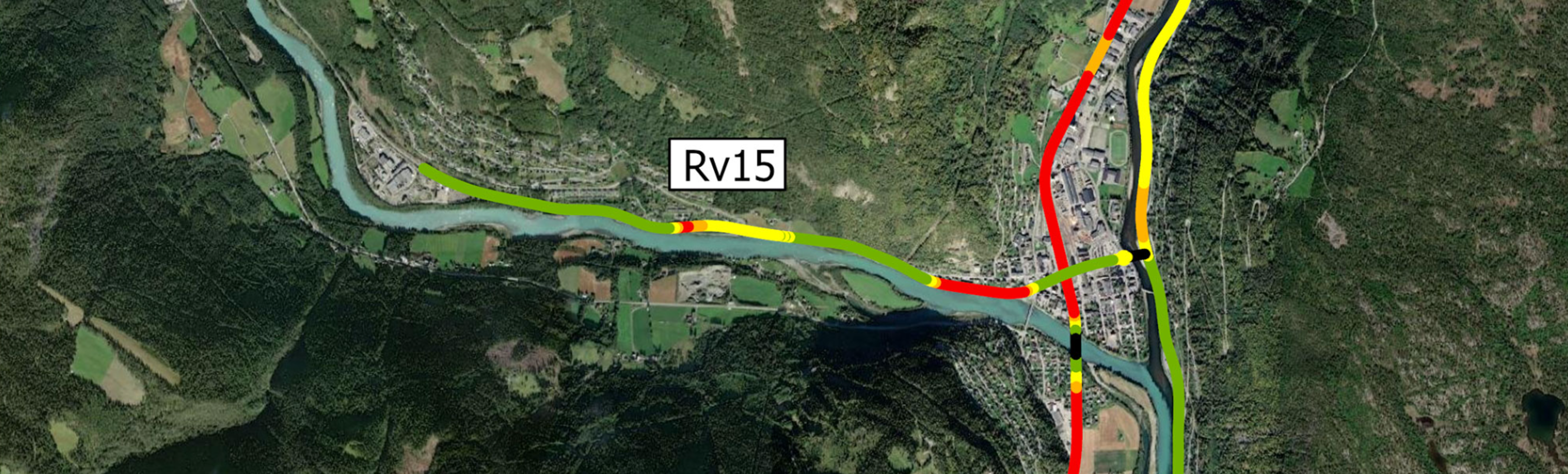 It is expected that E6 will close at 50-years flood levels, and due to long detour alternatives, time- and fuel costs for a closure is estimated to an average of 1.736.000 NOK. The Rv15 will only close with a 200-year flood, and comparable indirect costs per closure are 225.285 NOK. The railway is estimated to close every time the flood levels exceed the 50-year flood, and indirect costs of one closure is estimated to 197.842 NOK. It is expected that the increased frequency of closures due to climate change will affect the indirect cost even more than the direct costs. However, because the costs related to the duration of closure are based on the current situation, the indirect costs are only calculated based on today’s climate.