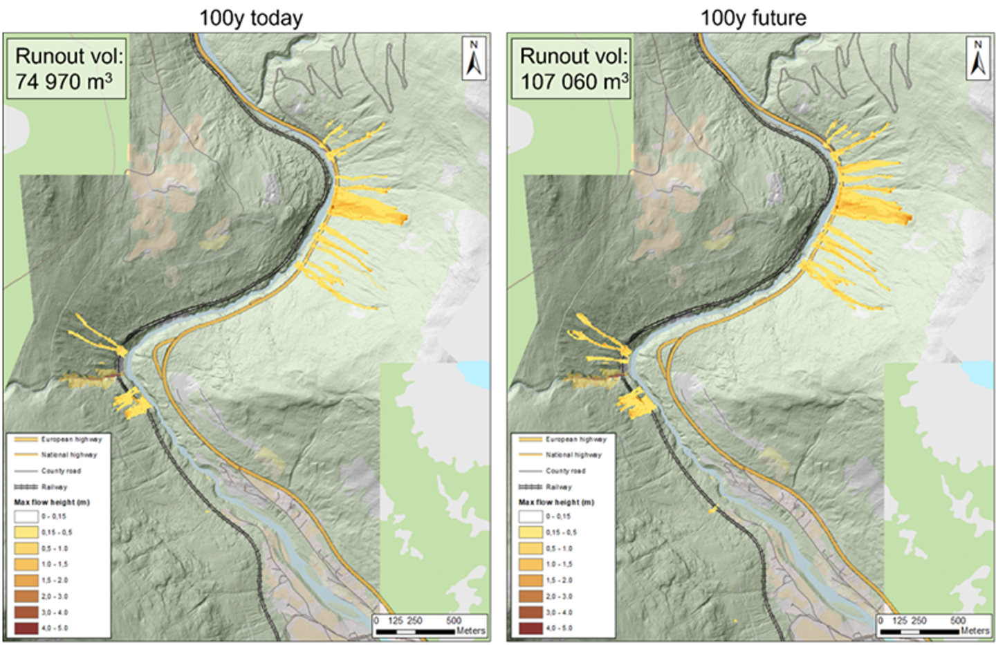 Figure 1: RAMMS runout simulation of landslides initiated by precipitation events of 100-year return period with today’s climate (left) and for a climate scenario with +20% precipitation (right).
